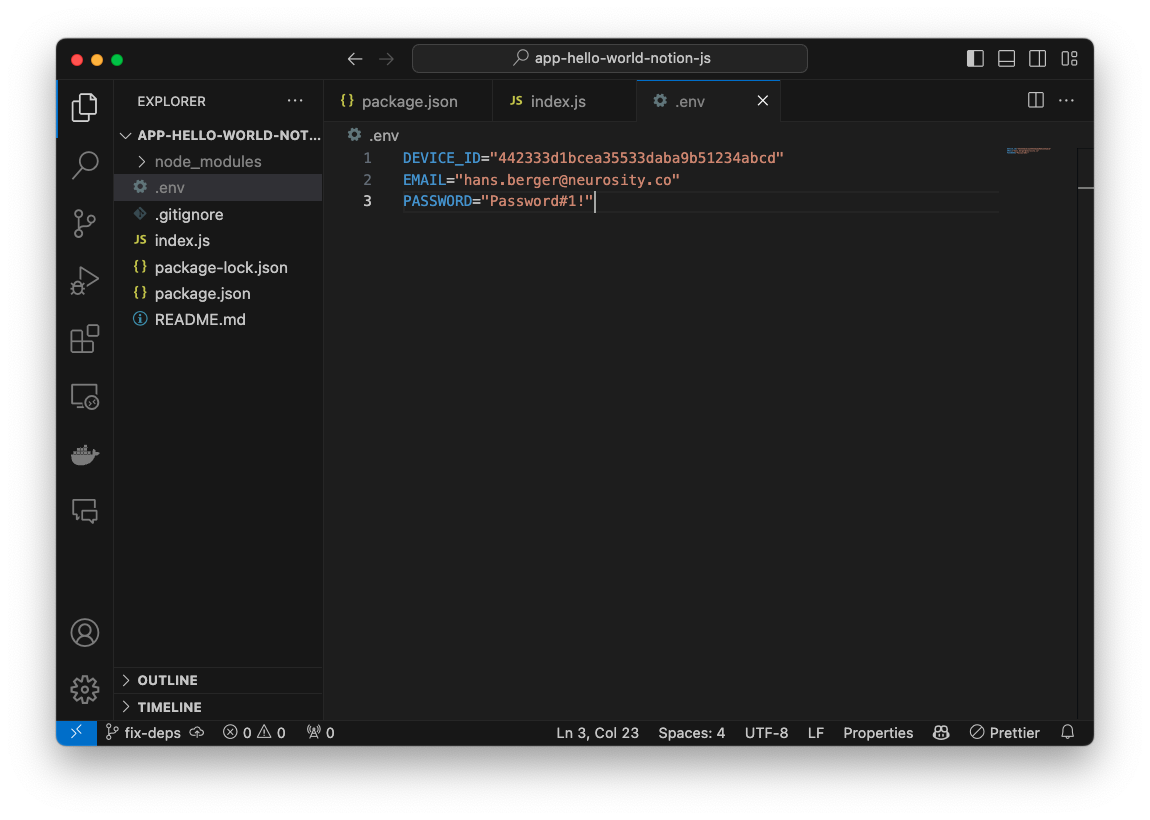 Next, we'll add a .env to store our deviceId, login, and password. Add a new file called .env and add your deviceId, email, and password. Learn how to find your device ID.
