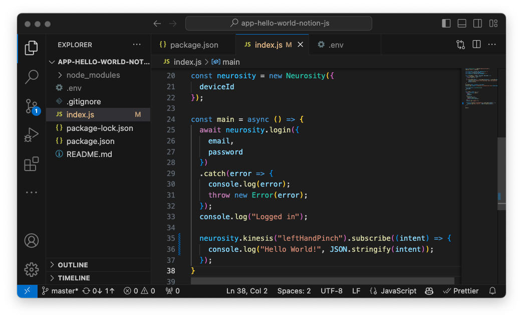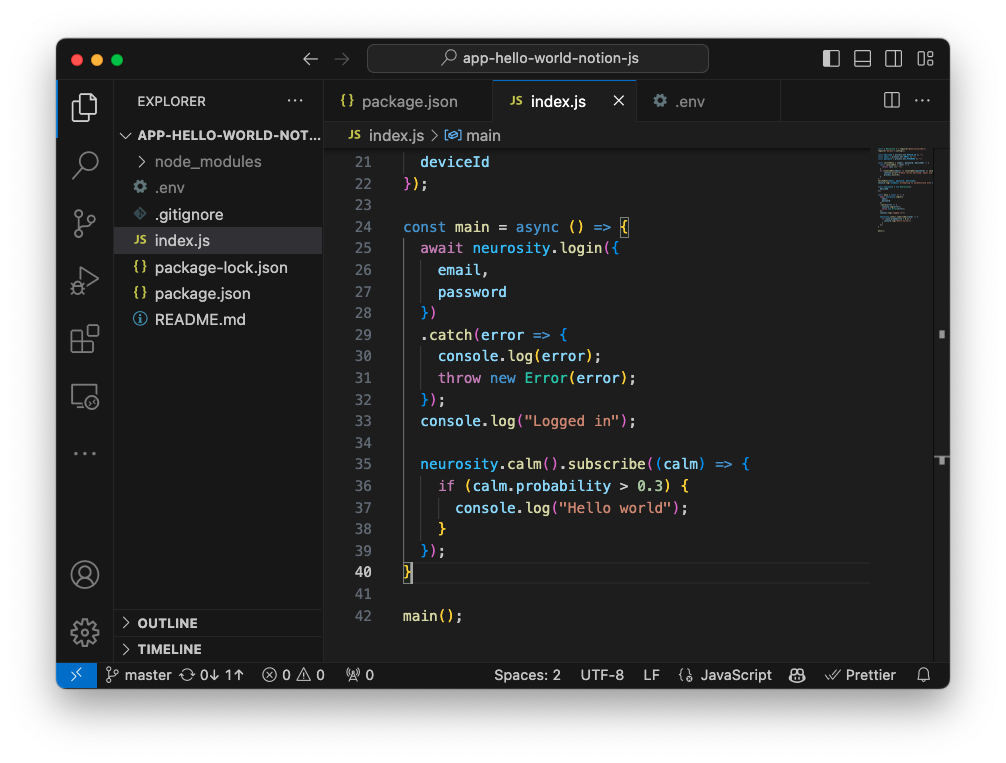 We'll be using VSCode to program this tutorial. For a little added fun, we recommend adding the Neurosity VSCode extension to track your flow state while programming. Check out our guide to installing and getting started with VSCode and the Neurosity extension.