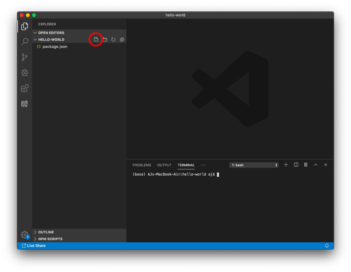 Your index.js file is now ready to print Hello World!
