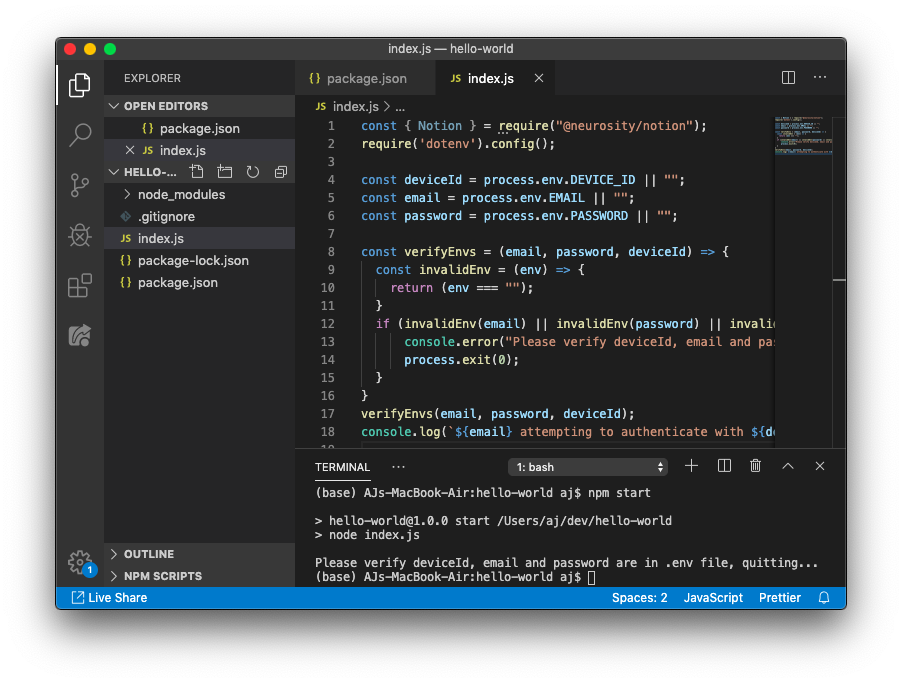 We need to use an async/await paradigm for authenticating to the device. Go ahead and create an async function called main to the index.js file.